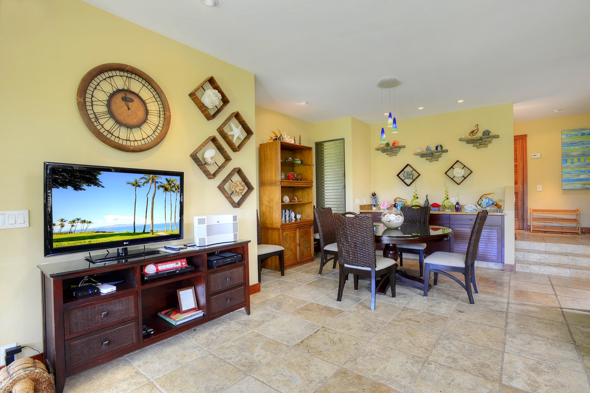 This is a First Floor condominium with big ocean views from the lanai and living room. Situated in Wailea Elua Village, 24 acres of lush tropical landscapes, luxury accommodations and breath-taking ocean views in a low-rise village atmosphere are featured.